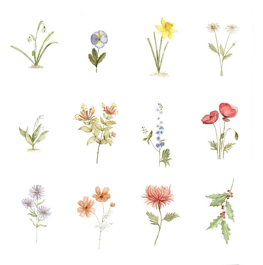 Met deze handgeschilderde bloem-kaarten kun je elke maand die ene bloem centraal stellen. Of gebruik ze gewoon als een losse kaart om te versturen!